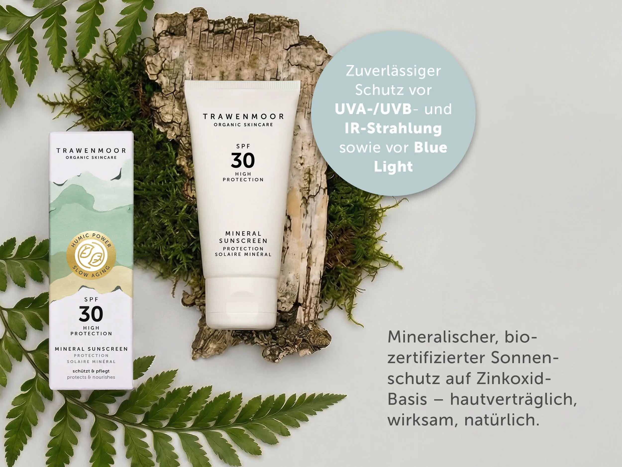 MINERAL SUNSCREEN SPF 30 offers reliable protection against UVA, UVB and IR rays, as well as against blue light and helps prevent photoaging and hyperpigmentation. The mineral-based formula with Zinc Oxide provides exceptionally gentle protection for the skin without leaving a white residue. A light tint ensures an even, fresh complexion. Nourishing, moisturizing and soothing active ingredients leave the skin feeling fresh and well-cared-for. Suitable for all skin types, ideal for sensitive skin as well.